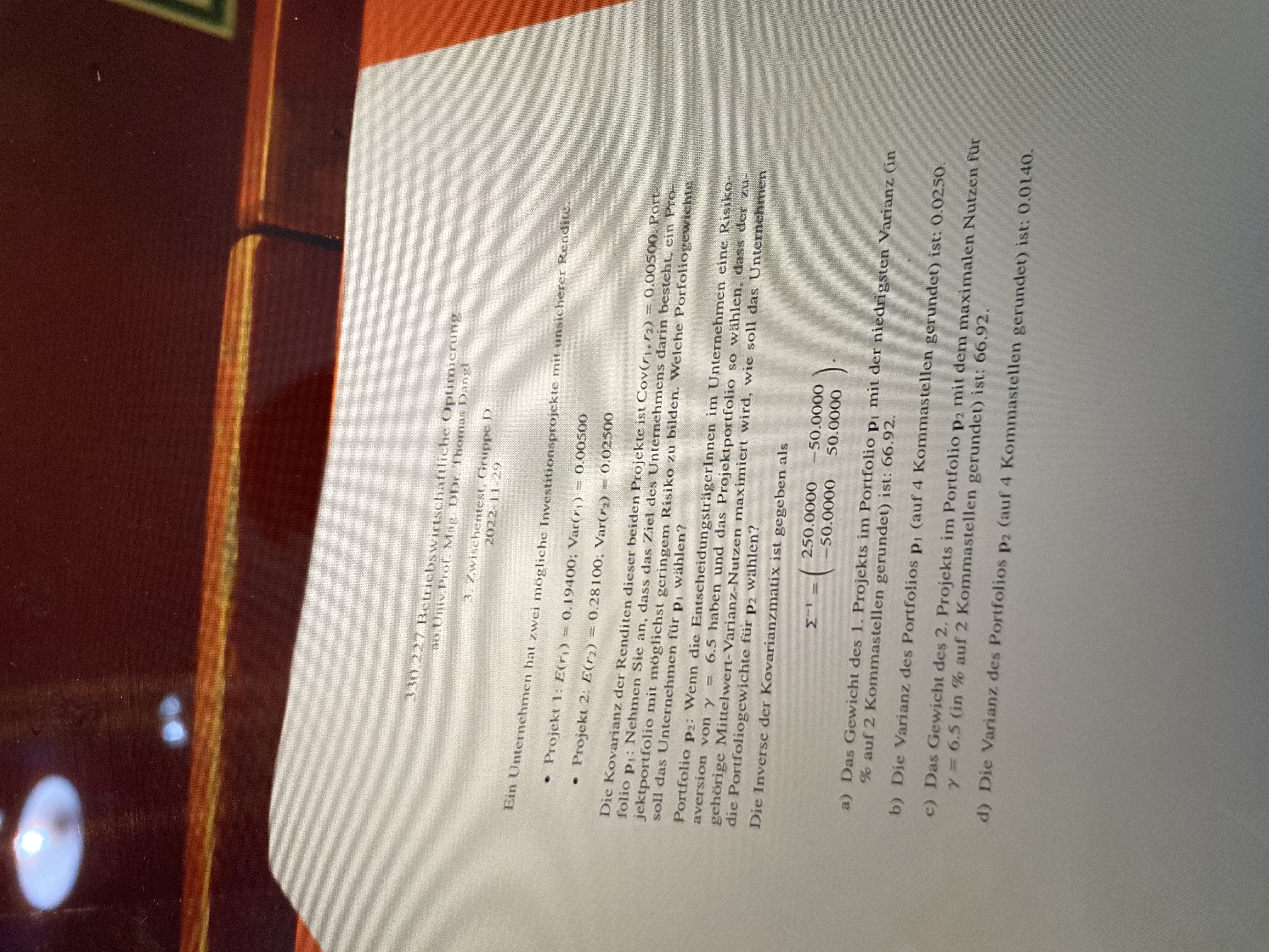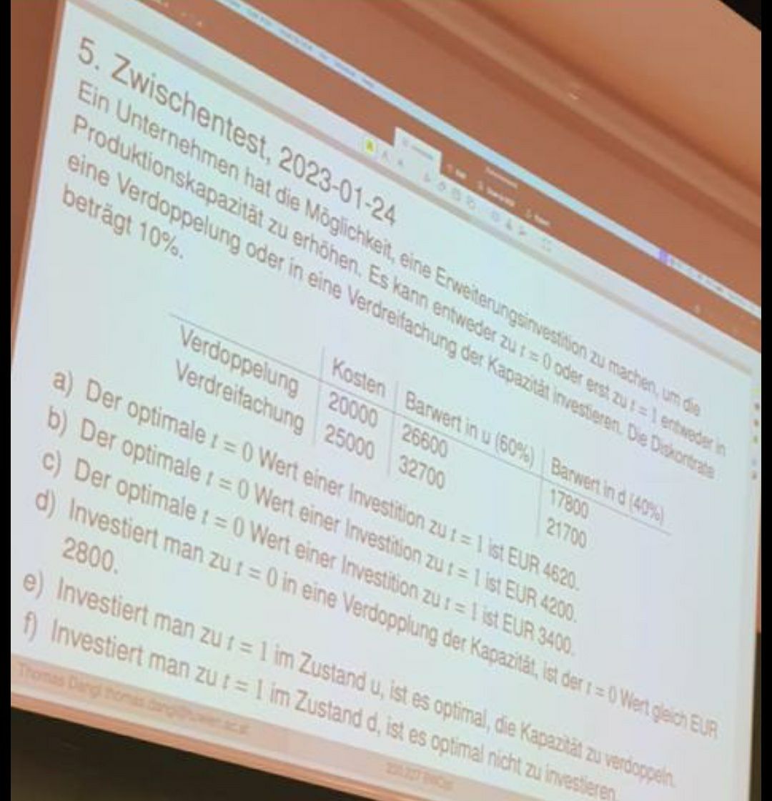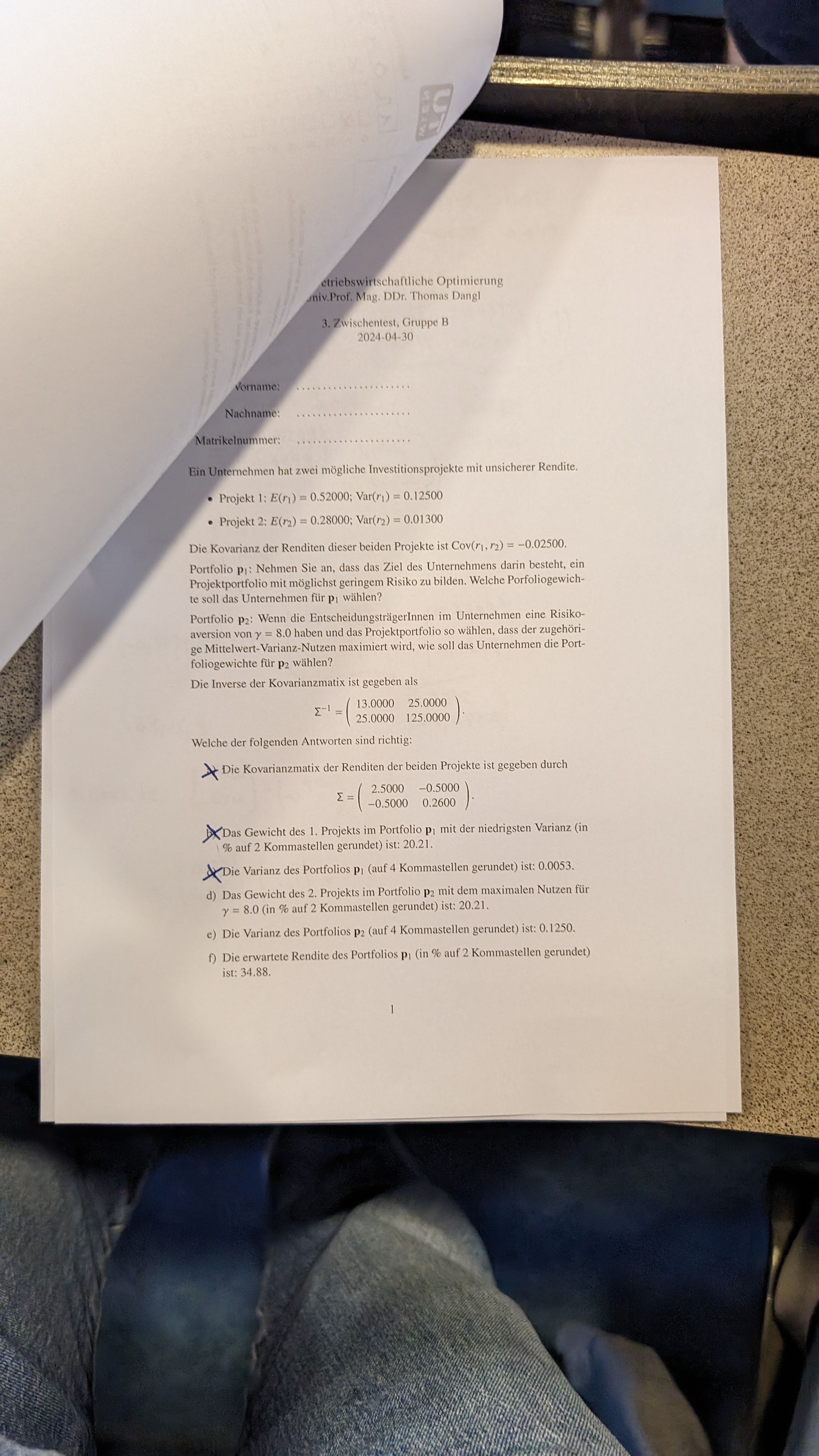 - Zwischentest: Frage wie sich der Funktionswert ändert wenn man die Nebenbedingung bei einem Minimierungsproblem lockert (nur zwei Antwortmöglichkeiten und eine ist richtig).